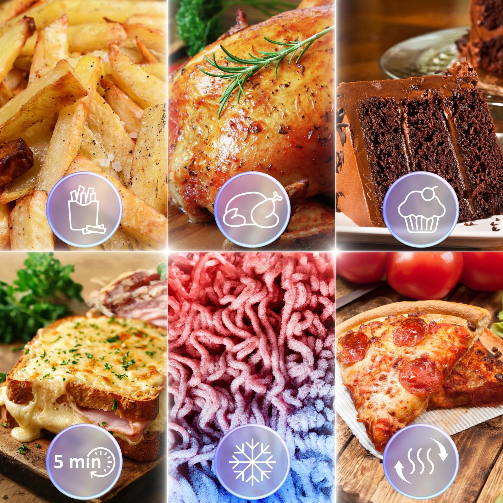 • AIR FRYER GRILLS WITH 6 PRE-SET FUNCTIONS – These six functions can be found on the touch screen panel of the electric air fryer with grill. They comprise AIR FRY, ROAST, DEHYDRATE, REHEAT, DEFROST, and BAKE. Each function on the health grill comes with pre-programmed temperatures and timers optimised for various cooking and BBQ grilling tasks. However, you still retain the flexibility to adjust these settings to accommodate your specific requirements and preferences.