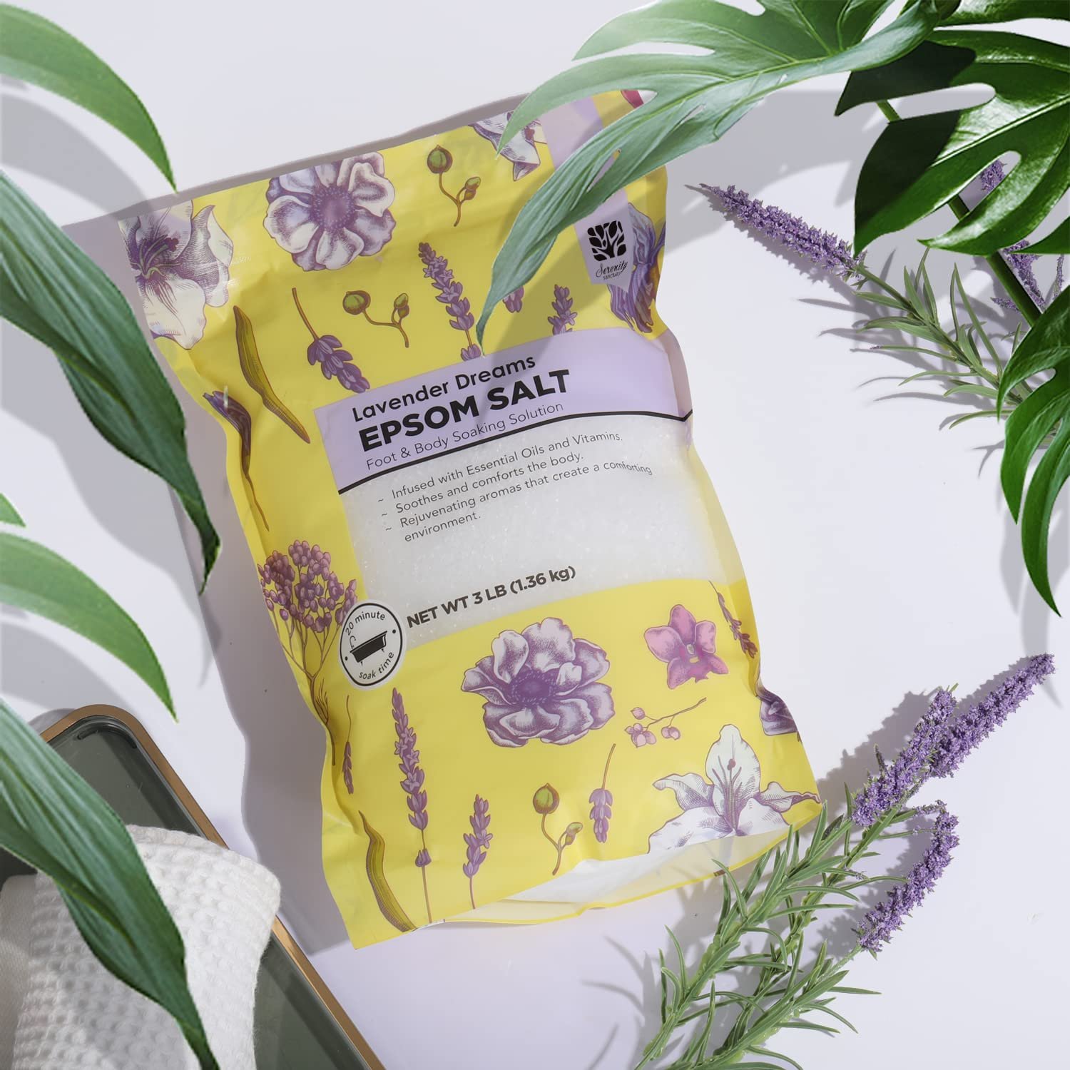 - Epsom Salt: The epsom salt is infused with epsom salt (Magnesium Sulfate) and essential oils. By adding a few epsom salts for soaking in a bathtub or foot bath, you can enjoy a comfy bath. Our Epsom salt can moisturize your skin