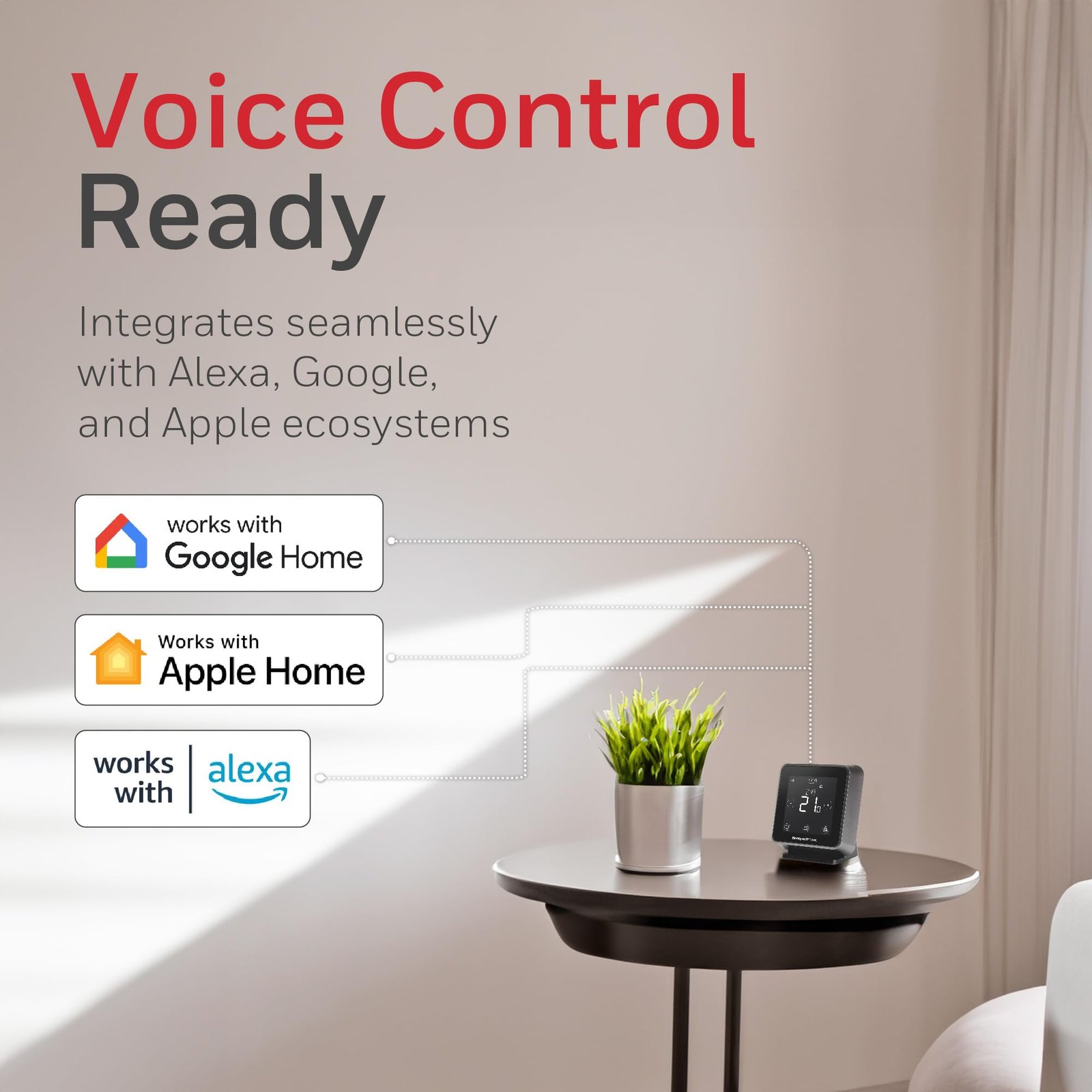 • Voice Command Ready – Compatible with Amazon Alexa, Google Home, and Apple HomeKit, this thermostat allows hands-free temperature control via voice commands and features 7-day programming with 6 setpoints.