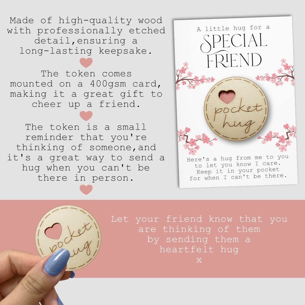 Details: Sending love and support can sometimes be difficult, but with the Pocket Hug Token, you can always be there for your special friend. This token is a powerful symbol of your affection and serves as a reminder that you will always be there for her. The 400gsm card has a space to write a message on the reverse side, making it a heartfelt gift. The beautifully laser-cut keepsake pocket token is of the highest quality and precision, making it a great gift on special occasions like birthdays, cheer up, get well soon, moving away, going to university or just a simple thinking of you. Our small family-run business offers a unique and thoughtful way to show your love and support for your special friend. She can carry it in her pocket, bag, or purse, and keep it with her at all times, knowing that you are always there with her in spirit.