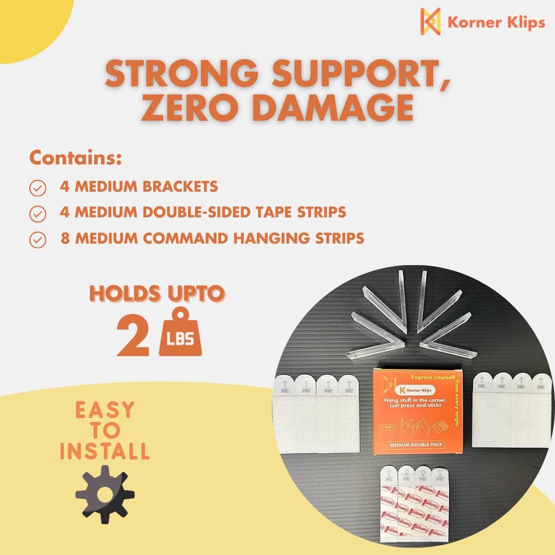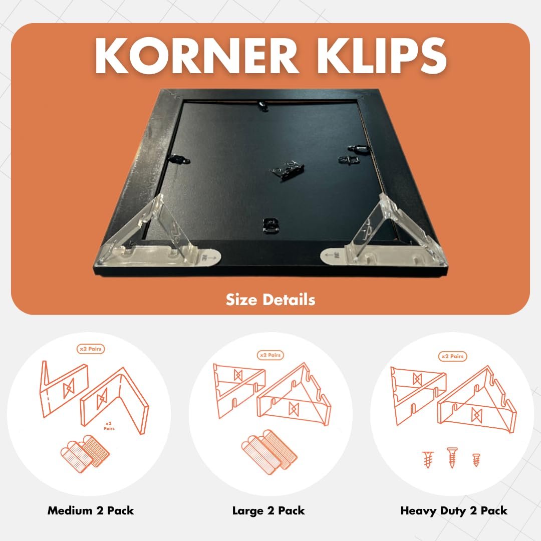 - Multiple sets included: Each order includes 2 sets (4 clips) of Korner Klips, so you can start transforming your corners right away..Innovative solution: Korner Klips are the innovative solution for corner picture hanging that will revolutionize the way you think about your corners. Don’t let your corners go to waste – order Korner Klips today and see the difference for yourself.