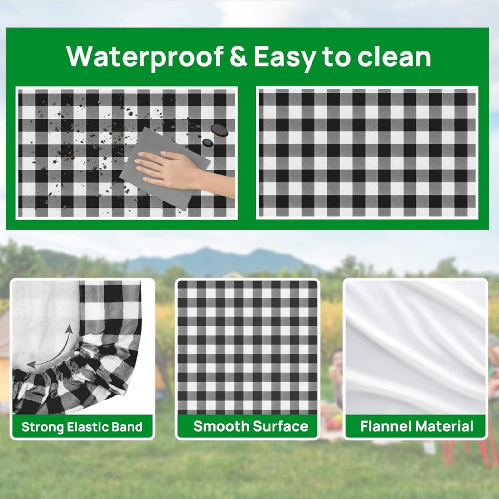 - Easy to use: Picnic table cloth is designed with elastic edges to fit snugly on the table and prevent it from slipping or blowing away in the wind. The tablecloth is lined with a soft flannel backing that not only adds friction but also helps protect the table and bench from scratches and damage.