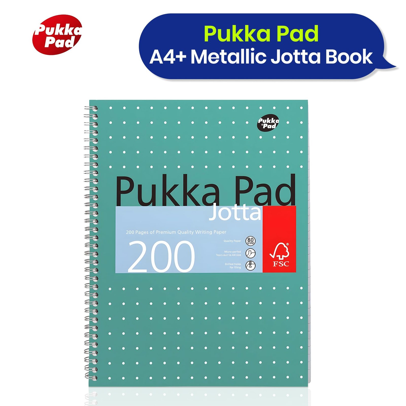 - METTALLIC JOTTA BOOK – Step up your note-taking game with the Pukka Pad A4+ Metallic Jotta Book. This wire-bound notebook features a sleek metallic green cover, blending style with functionality. Perfect for students, professionals, and anyone looking to organise their notes and tasks efficiently.