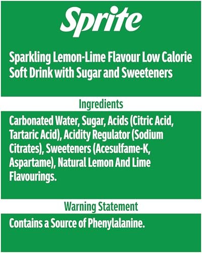 Seeleners. Ingredients: Carbonated Water, Sugar. Acids (Citric Acid, Tartaric Acid, Acidity Regulator (Sodium Citrates). Sweeteners (Acesulfame-K. Aspartame), Larl Lemon And Lime Flavourings. Contains a Source of Phenylalanine.